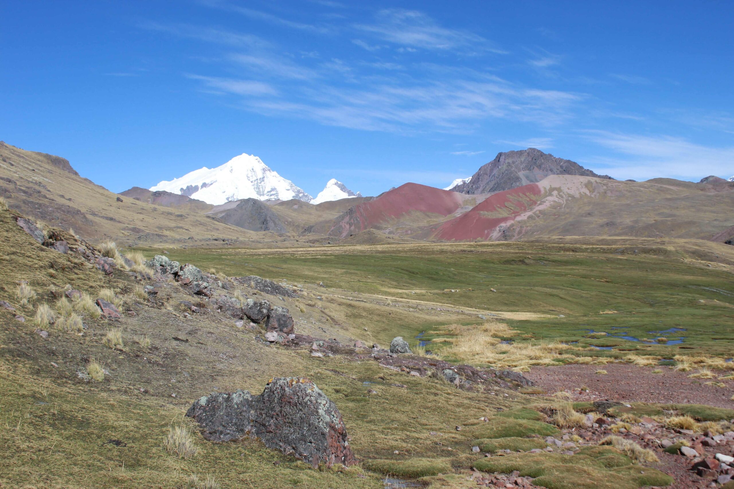 This trek through Ausangate allows you on the 1st day to enjoy a beautiful view of Mount Mariposa, inter-Andean valleys full of potato crops and relax at night under the stars in the thermal baths of Pacchanta. The 2nd day explores the 7 lagoons of Ausangate, all of different colors and has amazing views of the greenish lake of Qomercocha. During the 3rd day, the snowy Huayna-Ausangate can be seen in all its splendor, entering a landscape area similar to the Swiss Alps with the difference that here you can also see a reddish mountain and camping in an area overpopulated with Alpacas.