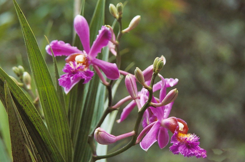 Epidendrum secundum, is one of the crucifix orchids, a little-known reed-stem species, which Dressler (1989) describes as «the Epidendrum secundum complex». According to Dressler, there are dozens of varieties. They can appear in shades of lilac, red, orange, yellow or white, and have a noticeable callus on the trilobed lip with fringes. The plant is quite cold and can tolerate a light frost.
