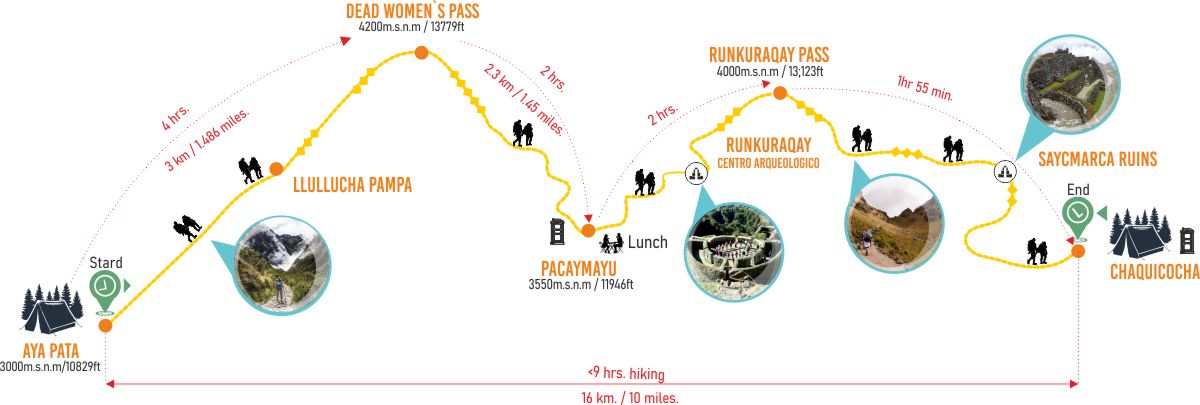 Once you arrive to the hamlet of Tarayoc, your cook is waiting you with a cold pineapple juice and a buffet lunch. After digesting for 30 minutes, you will get ready to keep hiking for 2 more hours to Ayapata, your official first Inca trail basecamp. Along the way you can see in all its splendor the Wacay Willke or Veronica snow-capped mountain. Also you will see the last villages of the Inca trail. Upon arrival your basecamp, the personal tents will be already set up for you to rest after a pretty and tiring day on the Inca trail. Also your porters will provide you warm water in plastic bowls, small towels and soap if you would like to wash up a bit. At night you will have a nice talking with your group and your guide with hot chocolate, popcorn, powder milk, teas and crackers. After a yummy dinner, you will head to bed to sleep like a drunk baby Alpaca.